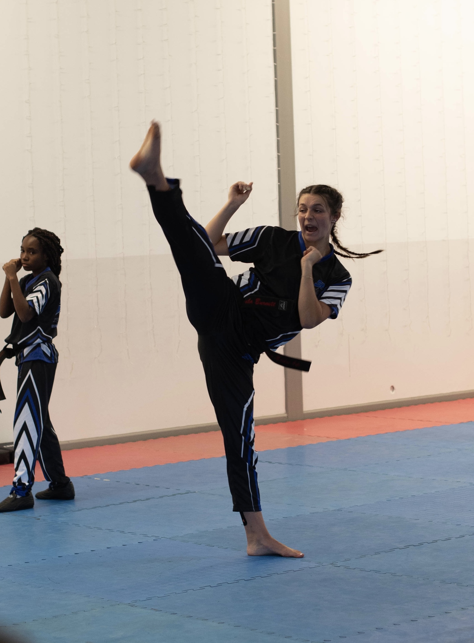 Teens and adults may attend our “adult class.” Thirteen and fourteen year olds may also choose to attend this class instead of attending the juniors classes. This class will move at a faster pace and will be for all ranks. This class is taught with a rotating curriculum which means beginner level students may be learning an “advanced” skill. Students are only tested on the skills that are considered to be at their level. The adults follow the same ranking system as the juniors and will receive an attendance stripe based on attending at least five classes a month. Each belt color also has an advanced level signified by a black stripe through the middle. To rank up to the next belt color, advanced belts must demonstrate and show improvement on the skills they are currently working on in class during testing each month.